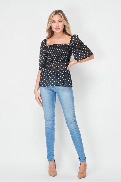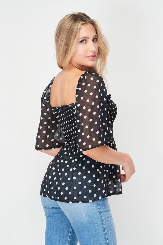 Experience the vibrant style of he Anicoletta's Polka-Dots Blouse! Boasting a square neckline and short sleeves, this 100% Polyester Blouse is sure to make a statement. From the office to the weekend, The Anicoletta's Polka-Dots Blouse will help you stand out in style. The soft, lightweight material and bold color palette make it perfect for any occasion, from relaxed to dressed-up. Make it your go-to Blouse for a fun, signature look!