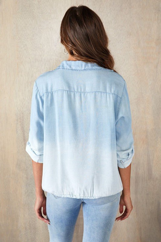 Stay comfortable while looking stylish with this Star & Rhinestone Pocket ItaliN Blouse. Â The top combines a classic button down design with ombre tencell style and adjustable sleeve length for ease of movement. Star & Rhinestone Pockets on the chest add that extra bit of flair. Made from a 50% Cotton and 50% Lyocell blend, it is perfect for any casual daytime look. Model is 5'9 wearing a size small.